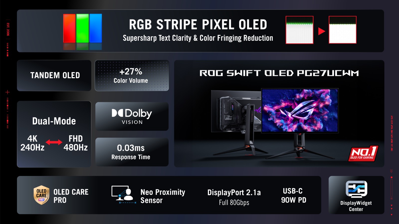 Um die Lebensdauer dieser Hochleistungspanels zu sichern, integriert ASUS umfassende KI-gestützte Schutzmechanismen. Das System „OLED Care Pro“ nutzt einen Neo Proximity Sensor, der erkennt, ob sich eine Person vor dem Bildschirm befindet. Sobald man sich vom Arbeitsplatz entfernt, wird das Display automatisch gedimmt, um das Risiko von Einbrenneffekten zu minimieren. Ergänzt wird dies durch das DisplayWidget Center, über das sich alle OLED-Schutzfunktionen intuitiv steuern lassen. Auch das Design wurde überarbeitet: Der PG27UCWM besticht durch eine transparente Rückseite und eine hochwertige schwarze Oberfläche, die das ästhetische Profil der ROG-Serie unterstreicht. Mit DisplayPort 2.1a UHBR20 ist der Monitor zudem bestens für zukünftige Grafikkartengenerationen gerüstet, da er die volle Bandbreite von 80 Gbit/s unterstützt.
